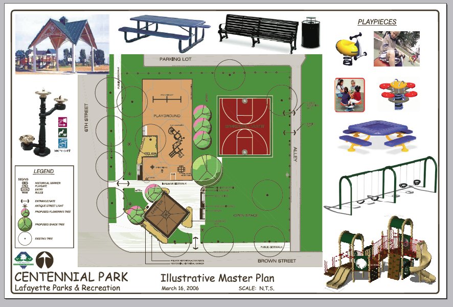 Back in 2005 the Historic Centennial Neighborhood Association (HCNA) began laying the groundwork for the redevelopment of Centennial Park. Built on the location of the former school from which the neighborhood was named, the park was showing its age and was under-utilized by the area's youth. The City of Lafayette and its Parks Department developed a method for local residents to assist in creating a vision for how the community parks should function and appear. This planing process resulted in this Master Plan which was unanimously approved on March 21, 2006 by the Lafayette Park Board of directors. Take a look at the new Centennial Park